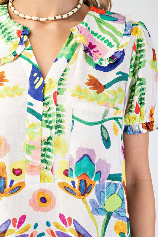 Pleated Linen Long Sleeve Top with Ruffle and Piping Details