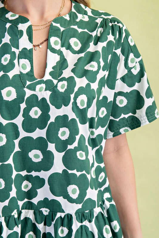 Short Sleeve Babydoll Dress with Binding Trim and an Open Slit Neck