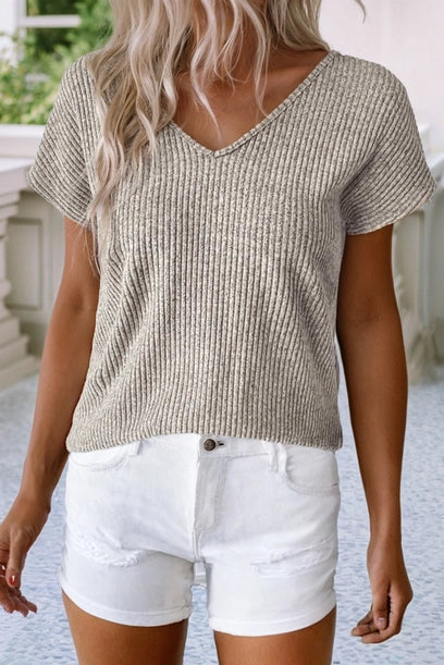Ribbed Short Sleeve V Neck Colorblock Bow Back Top