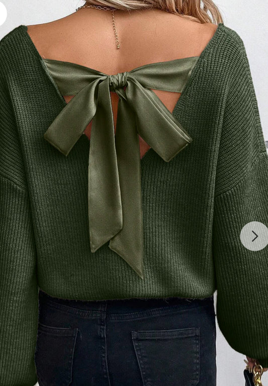 Lantern Sleeve V Neck Knot Back Sweater