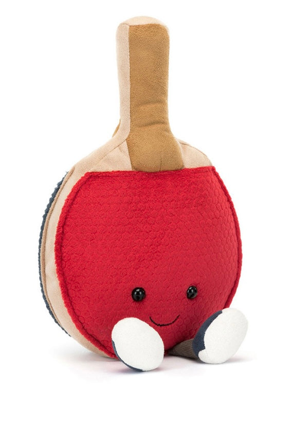 Amuseables Sports Table Tennis is gorgeously textured and ping-ponging with color! From that caramel-nougat suedette handle to those textured panels in red and blue – and you can’t miss those cream-and-navy trainers, embroidered in vibrant red. To you