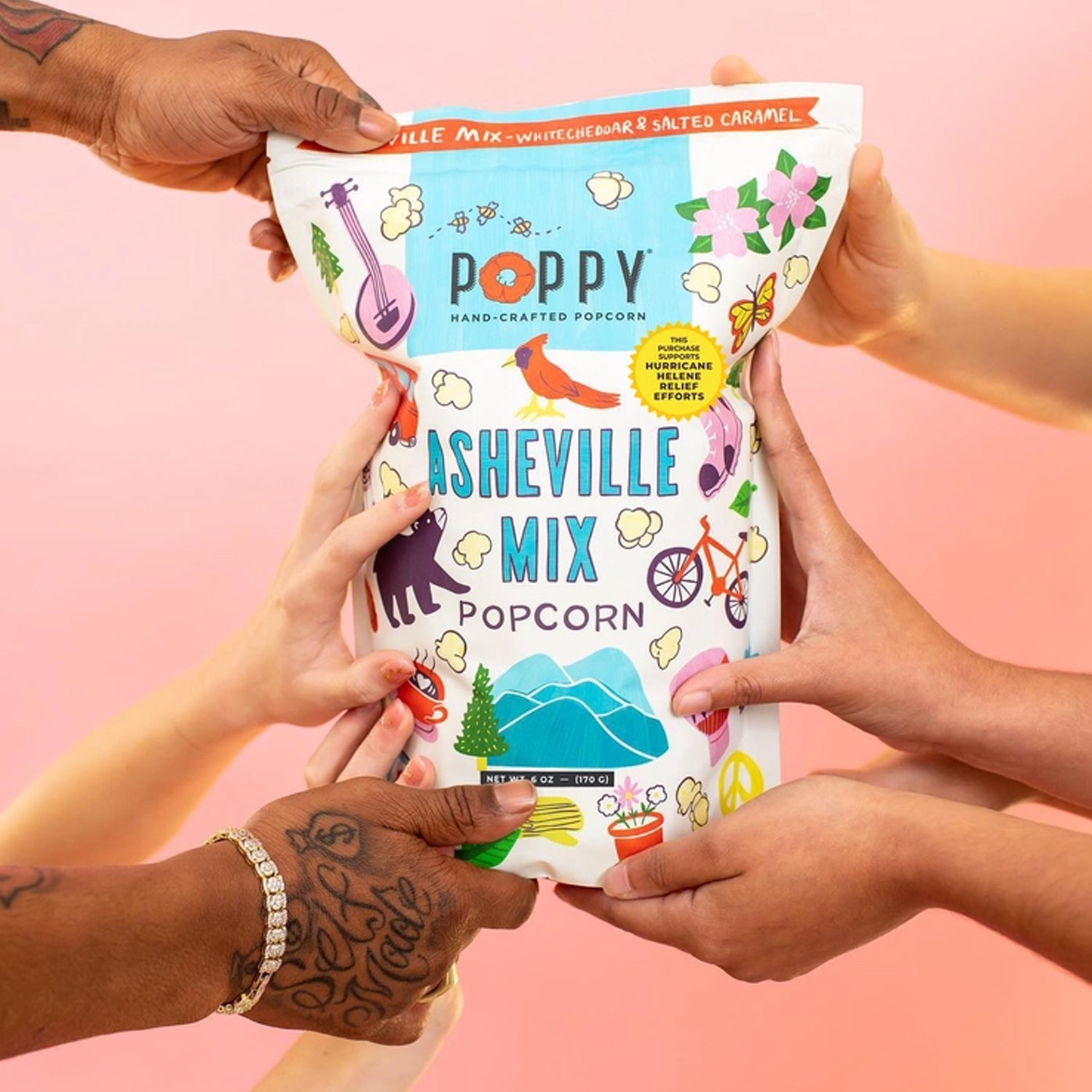 White Cheddar & Salted Caramel—two Poppy favorites with purpose! $2 from each bag goes to Optimist Ventures, helping Asheville entrepreneurs after Hurricane Helene.