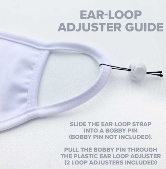 - Ear loops are elasticized and optional size adjusters are included with each mask. For a more snug fit, add the size adjusters to each ear-loop. Please see our image which shows how to easily add the adjusters to your ear loops. Should your face mask arrive with ear loop adjusters already on (our original packaging method) and you prefer a looser fit, you may remove the size adjusters.