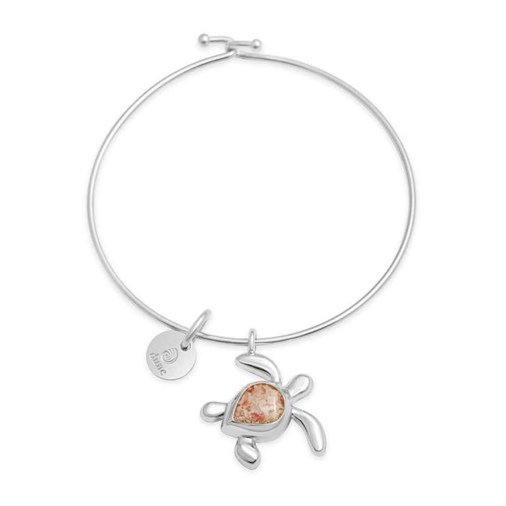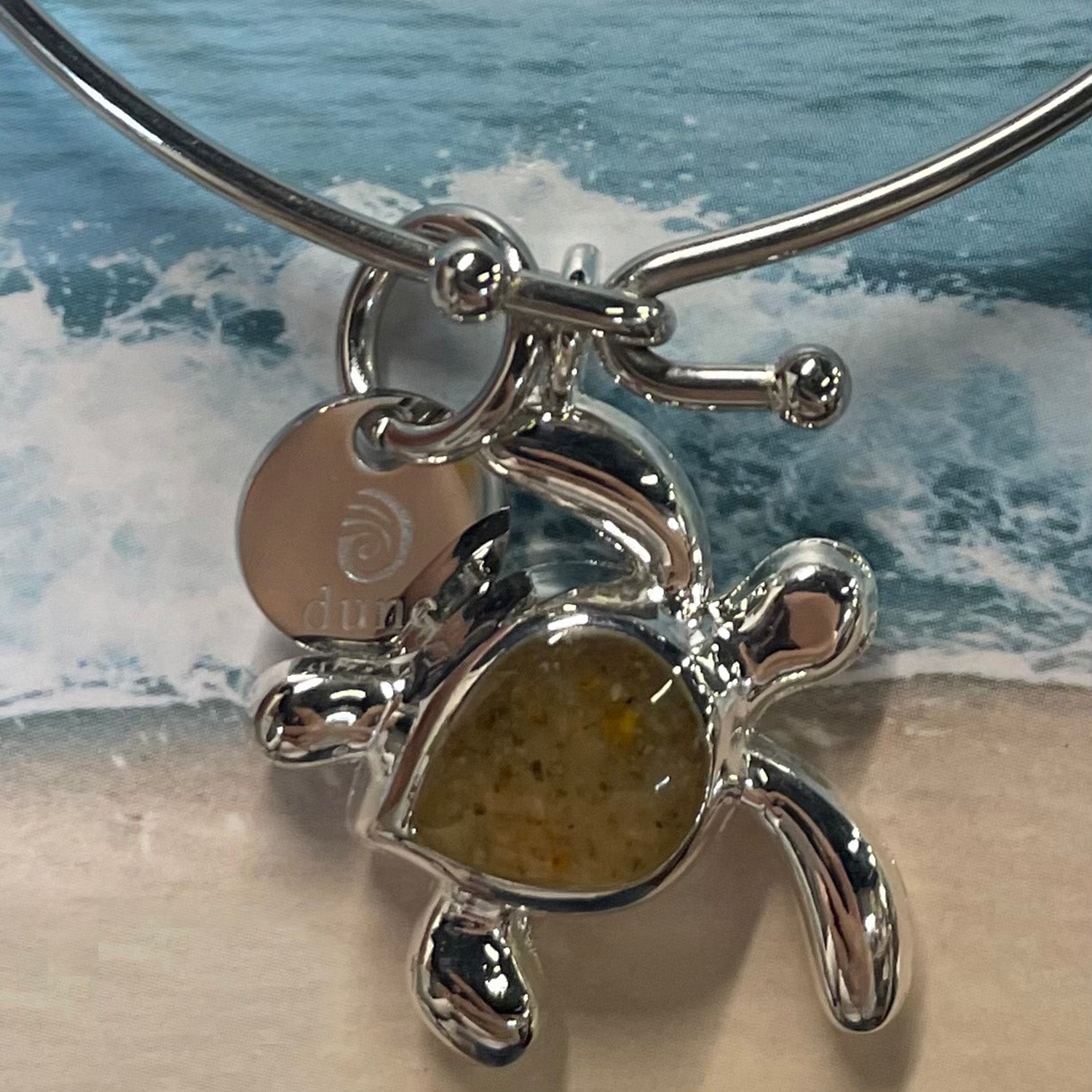 This sterling silver turtle bangle evokes the calm spirit of one of our favorite sea creatures. Swimming serenely on your wrist, this charm is filled with your choice of sand or earth elements. Whether it’s an amazing day swimming at the beach or shell collecting on your favorite shore, Dune will use sand or earth elements from that moment and capture your memory forever. Approximately 24mm, about the size of a quarter.