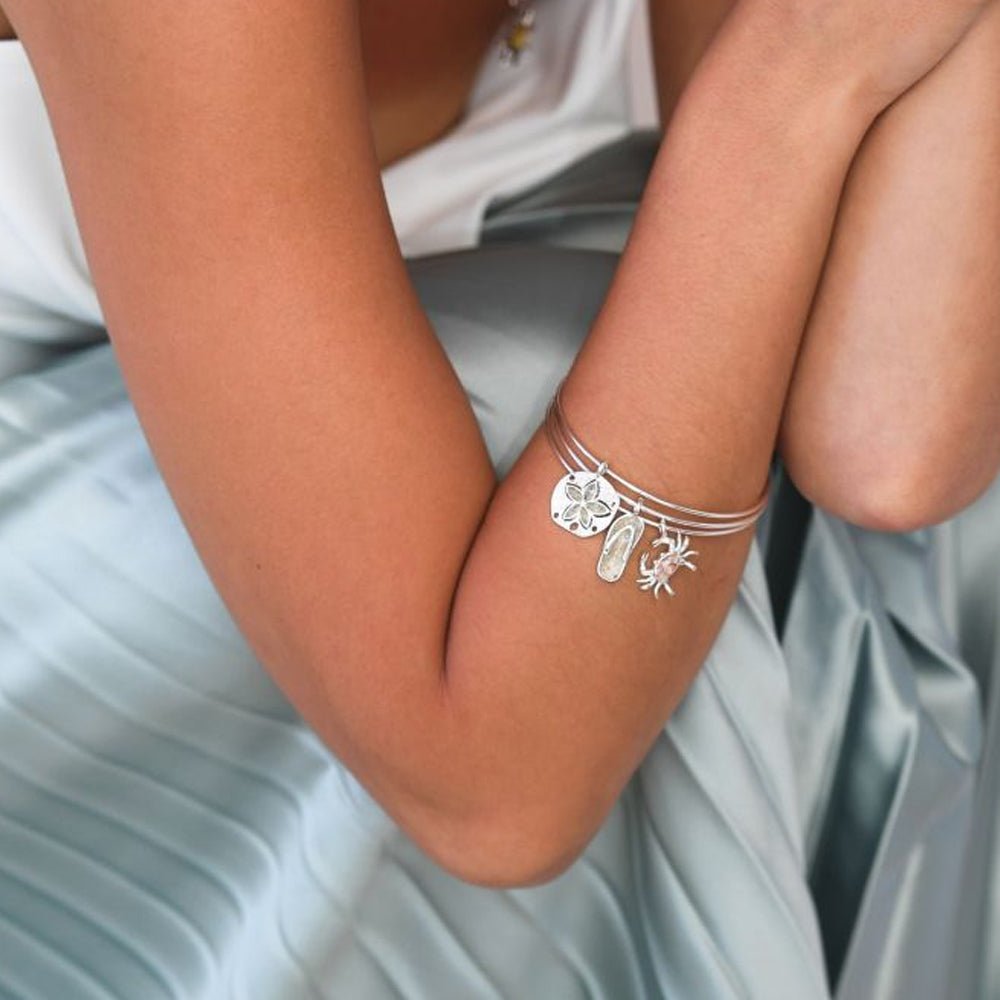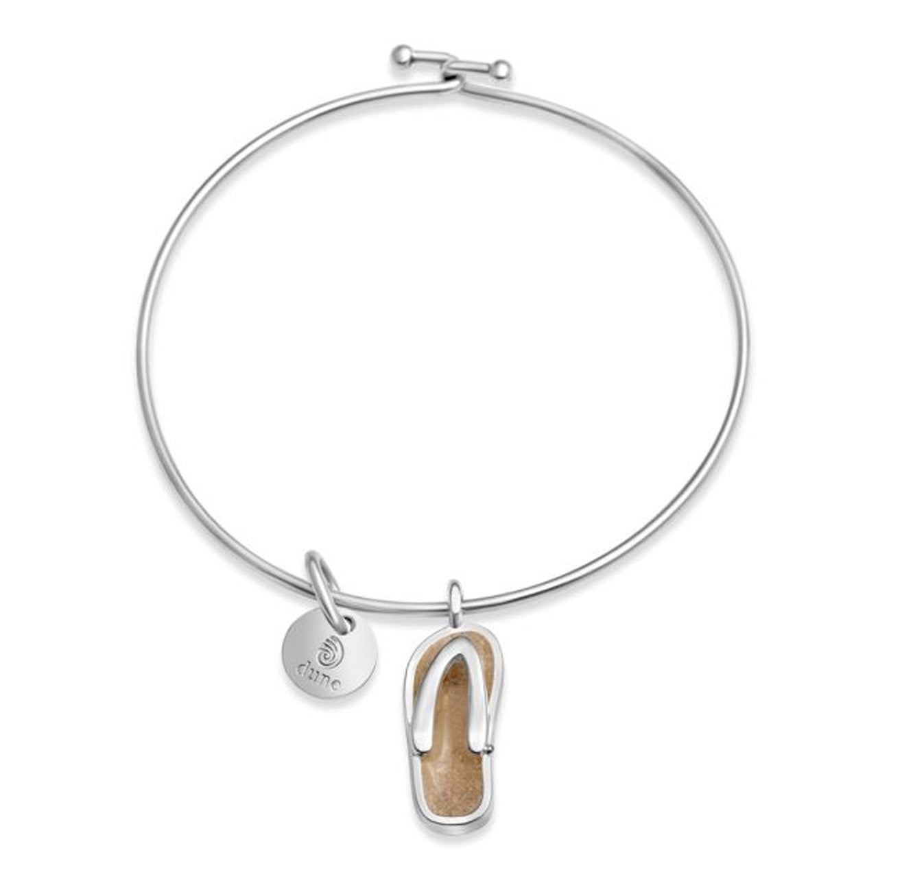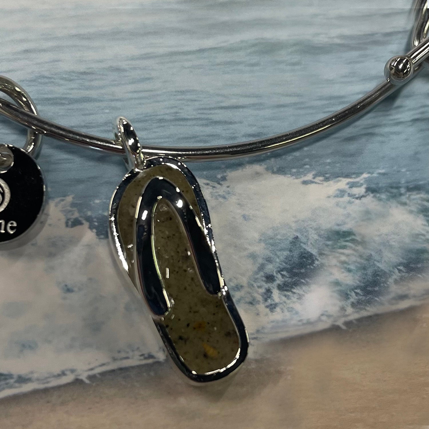 Flip flops are the quintessential symbol of summer fun! Wear your summer memories all year round with our sweet & petite, sterling silver flip flop bangle. Each piece is filled with your choice of sand and layered to a slightly recessed, glass-like finish.