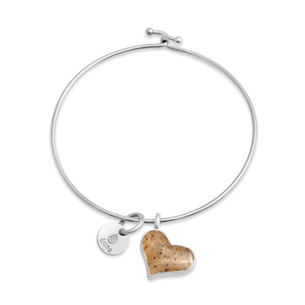 Stack your favorite travels and experiences on your wrist with our Heart Charm Beach Bangle. Whether it’s an amazing day on the golf course, swimming at the beach or a record breaking win at the ballpark, Dune will use sand or earth elements from that moment and capture your memory forever. This heart shaped charm is approximately 19mm in diameter and filled with your choice of sand or earth element, layered to a slightly domed, glass-like finish. 19mm in diameter, a little bigger than a dime.