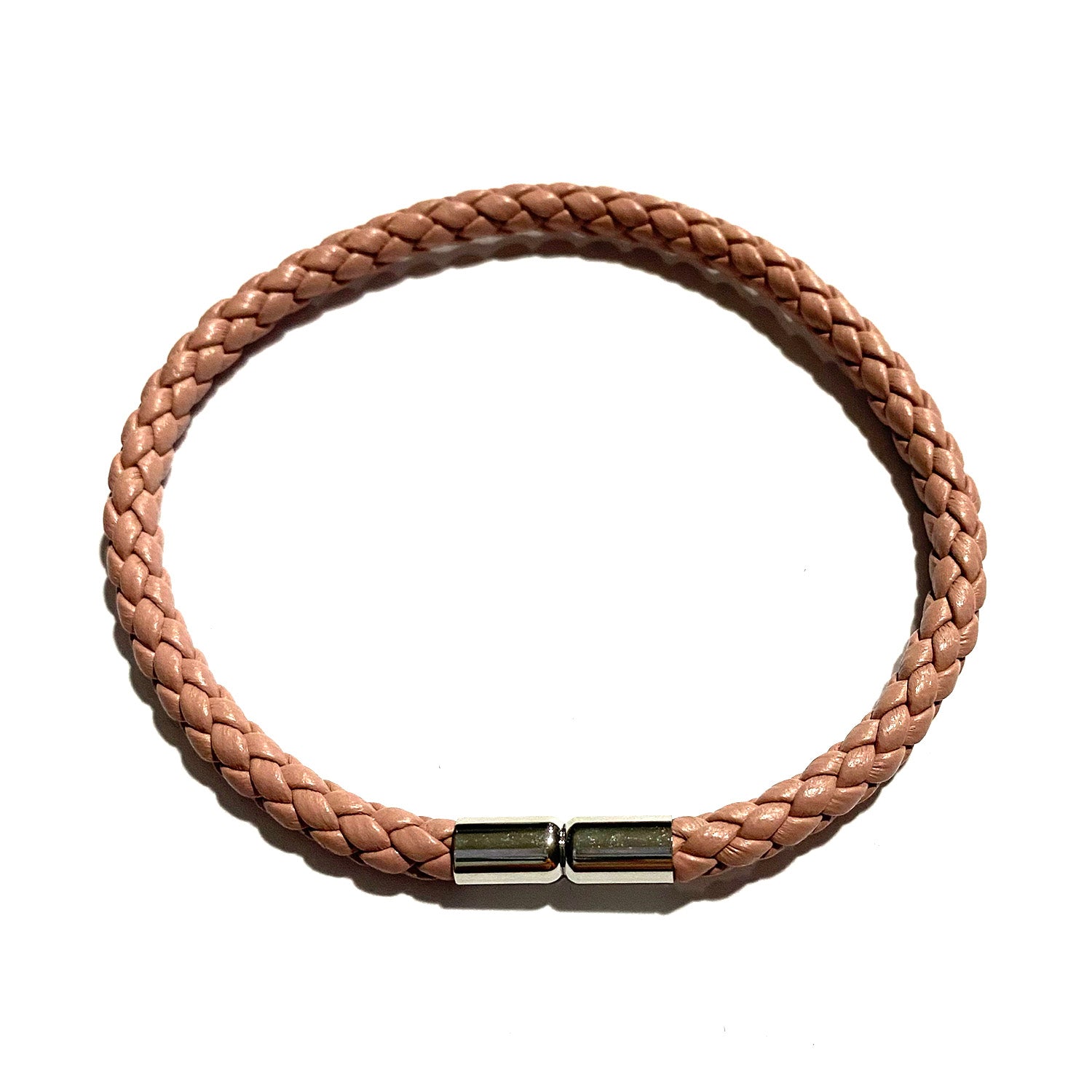 These bracelets are made of leather and have a magnetic closure for your convenience.