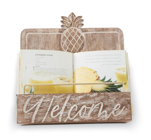 Mango wood cookbook stand features hand-carved pineapple, sentiment and brass finished metal accent bar. Stands with coordinating brass hinged back easel.