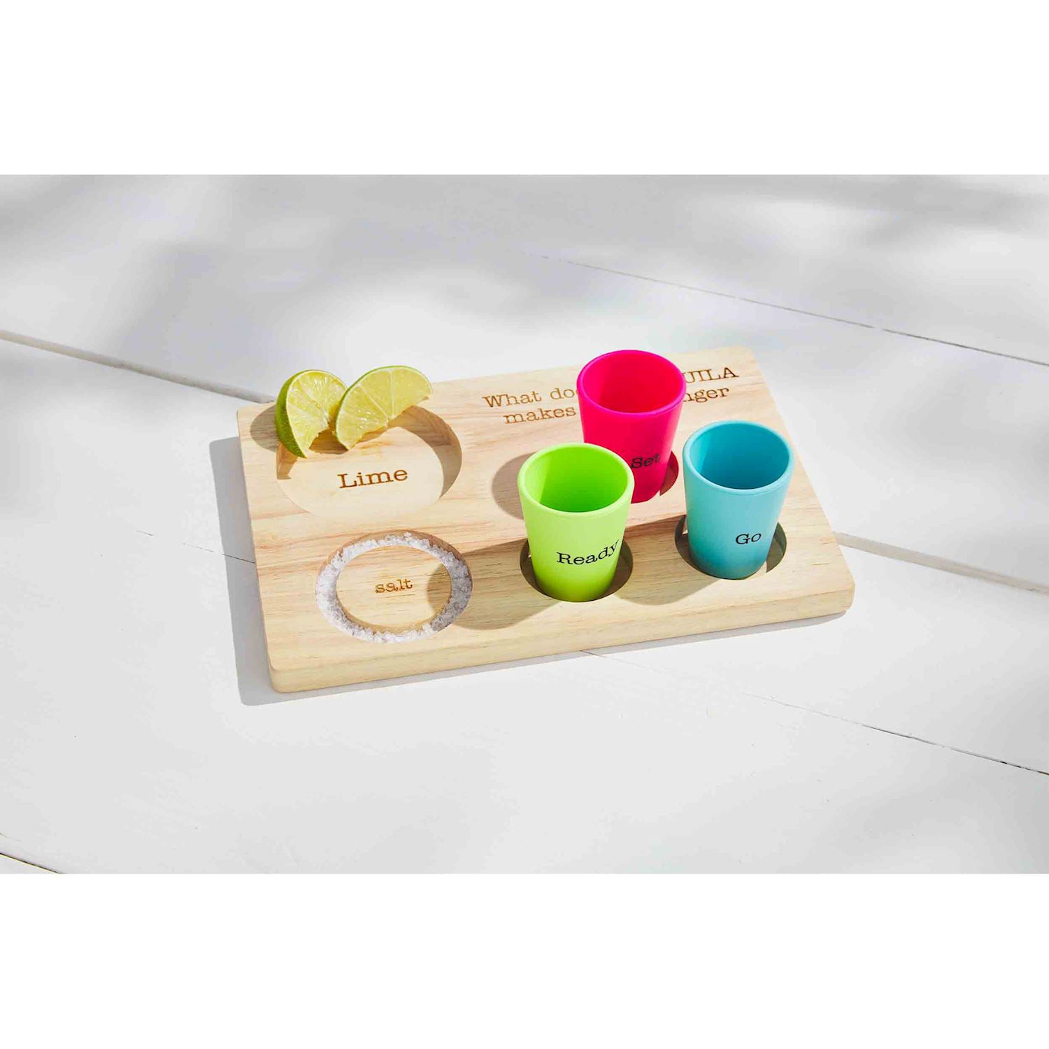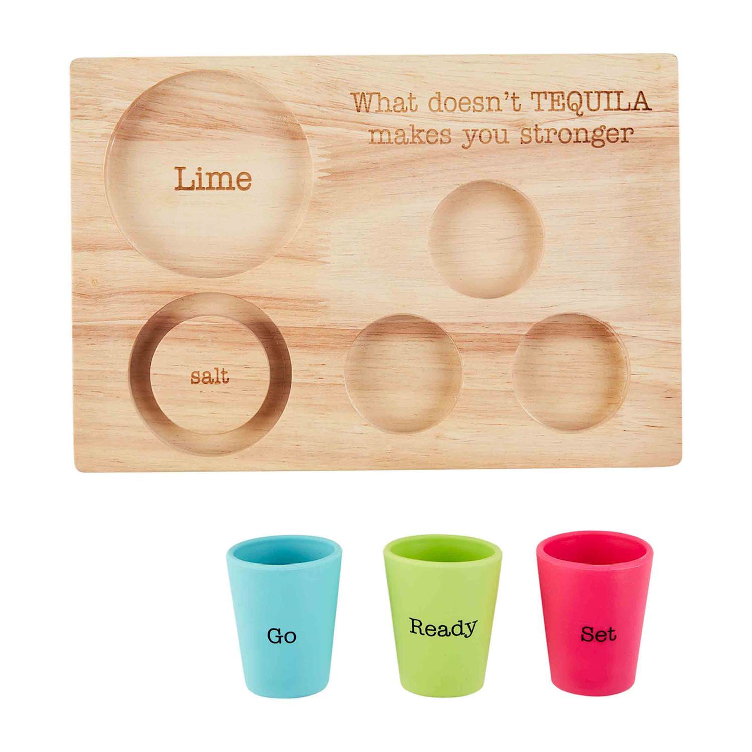 4-piece set. Engraved wooden board features wells to hold limes, salt for rimming glasses and areas to hold three included silicone shot glasses.