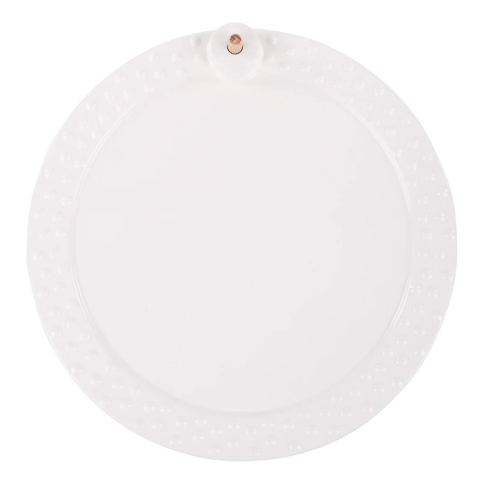 Make a statement at your next gathering with our white round platter, featuring ornamental toppers (sold separately). Great for holidays, Special Events, Tailgates, & more! Simply attach one of our optional toppers to the wooden peg included with your platter to add seasonal charm and unique personality! This ceramic serving tray can hold any type of dish you dream in style and grace with its neutral design and textured edge for fine detail!