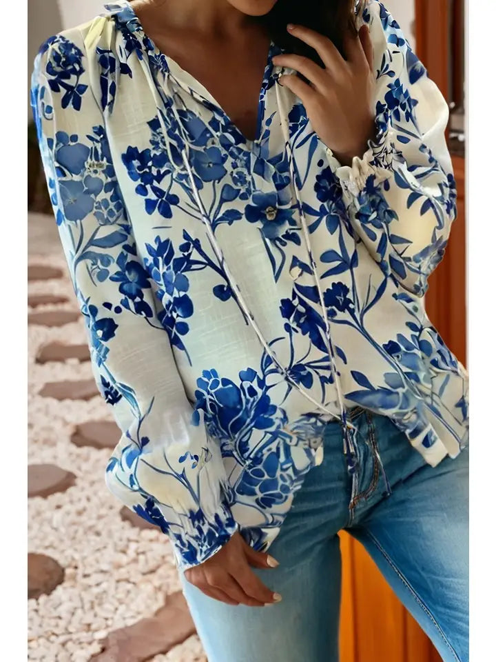 Floral Long Sleeve Lace-Up V Neck Blouse