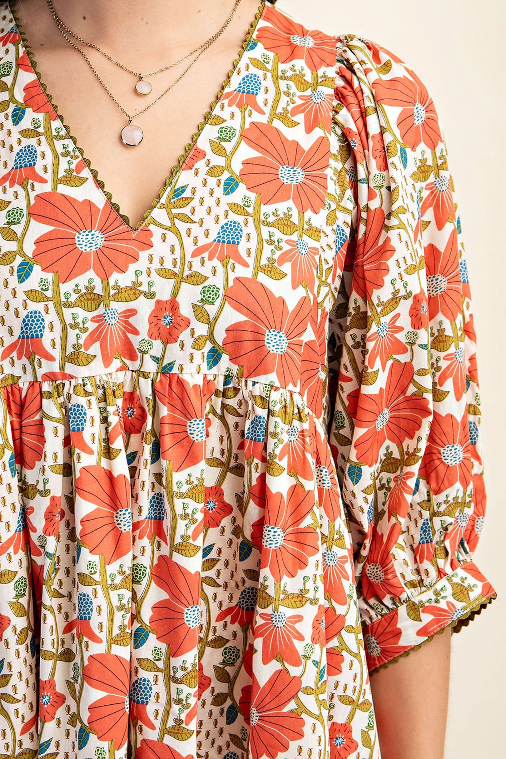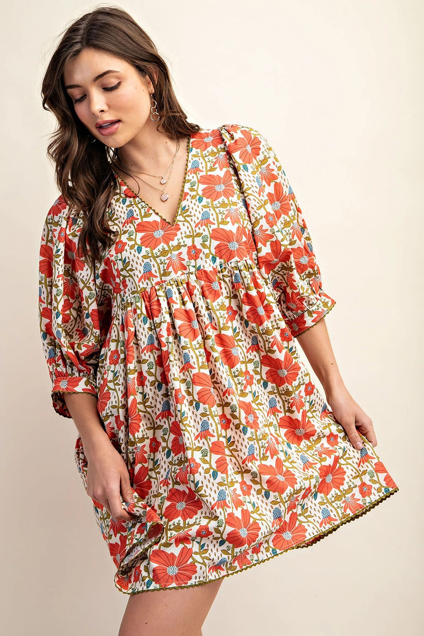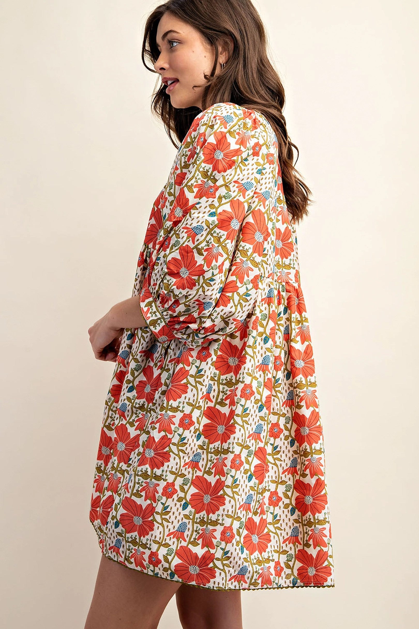 Floral Print Mini Dress with Puff Sleeve and Ric-Rac Trim
