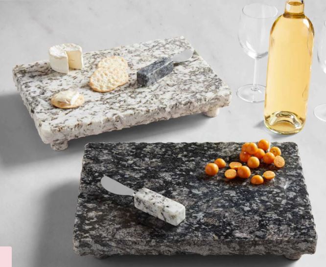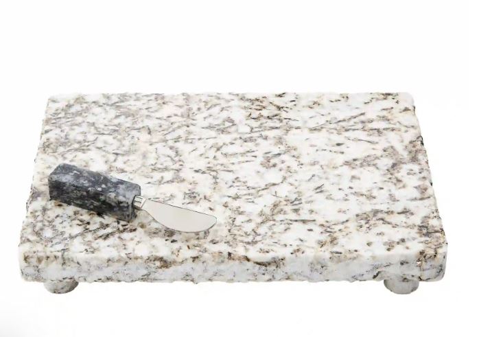 Take your cheese board to the next level with our footed black or gray granite cheese board. The two piece set comes with a footed granite board. The board features a gray granite pattern. The footed cheese board arrives with coordinating metal spreader that features a black granite handle and metal spreader.