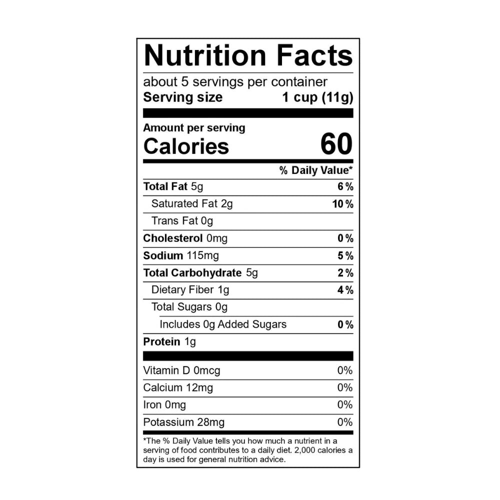 Ingredients: Non-GMO Popcorn, Sunflower Oil, RBD Coconut Oil, White Cheddar Cheese Powder (Cheddar Cheese [Milk, Cultures, Salt & Enzymes], Disodium Phosphate, Silicon Dioxide added as a Flow Agent at less than 2%), Cheddar Cheese Powder (Cheddar Cheese [Milk, Salt, Cheese Cultures and Enzymes], Whey, Buttermilk, Salt, Disodium Phosphate, Annatto Extract), Sour Cream Powder (Sour Cream [Cream, Cultures & Lactic Acid], Cultured Nonfat Milk Solids, Citric Acid), Celtic Sea Salt, Garlic Powder, Onion Powder, Paprika, Jalapeño Powder, Black Pepper, Cayenne Pepper