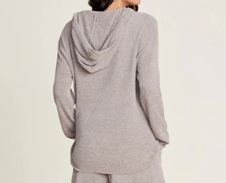Throw on our new airy-yet-cozy, fully ribbed henley hoodie. With a classic mid-hip length, not only is this a great basic, it is elevated with beautiful coconut buttons, a drawstring tunnel hood, and diagonal rib fashioning details at sides. Model is 5’8” and wearing a size S