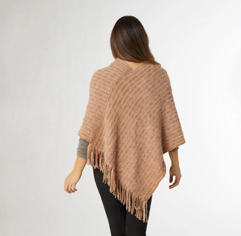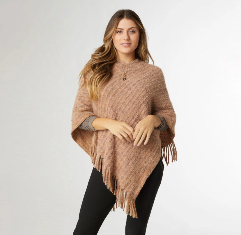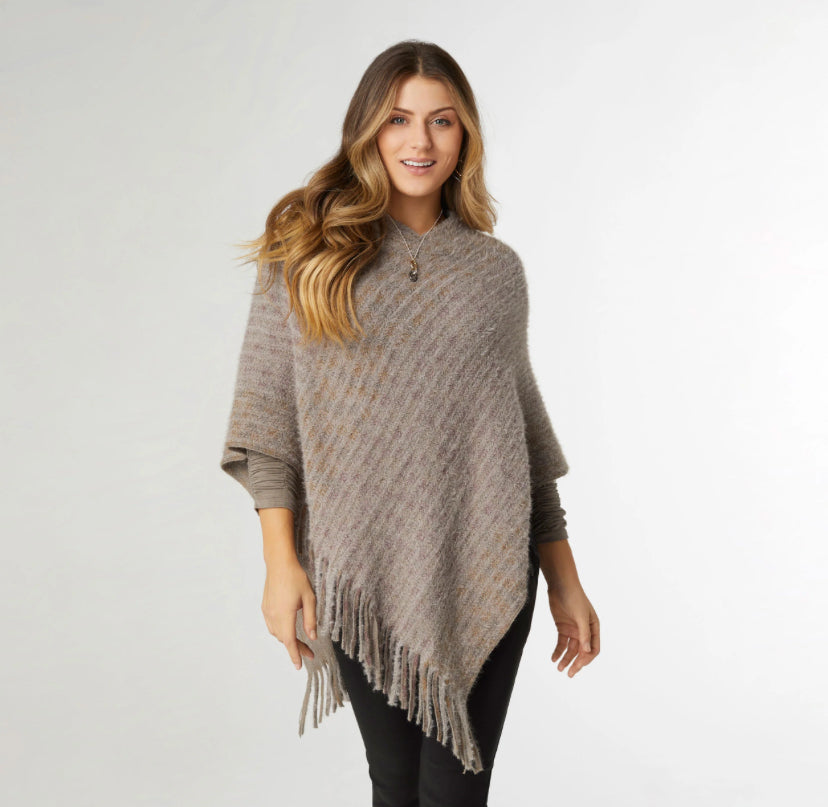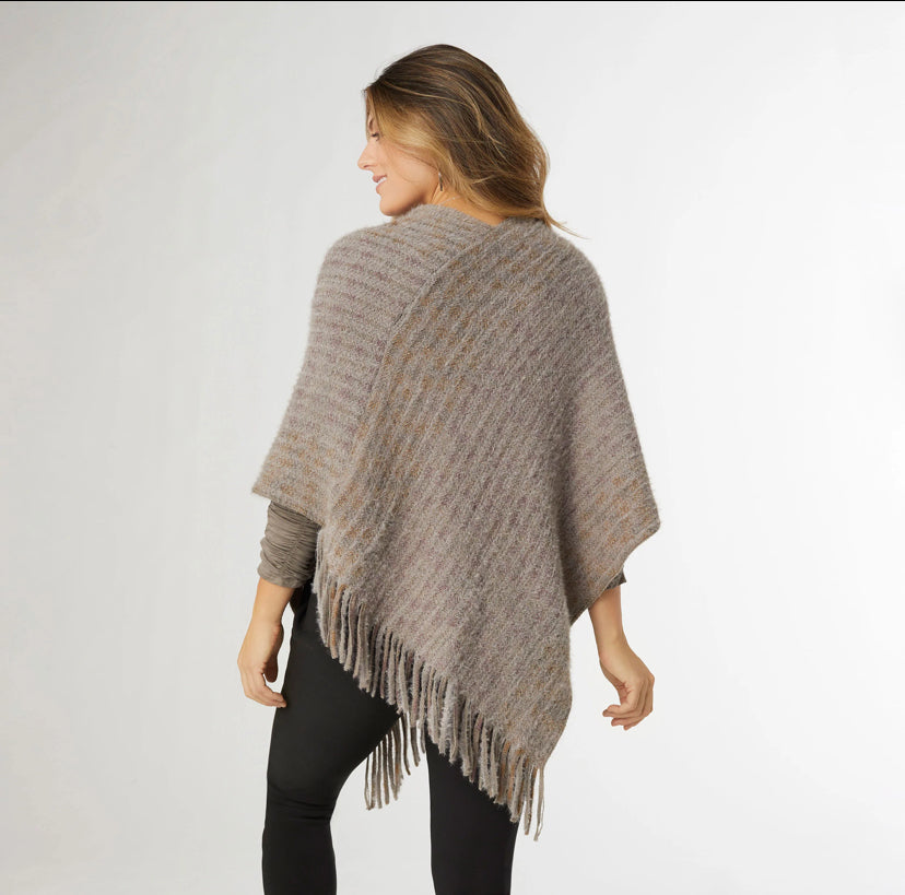 Add a boho-chic vibe to your wardrobe with the Rylee Striped Poncho. The one size design makes it easy to throw on over any ensemble, while the fringe details give it a playful flair. A must-have for any fashionista! Materials: Acrylic.