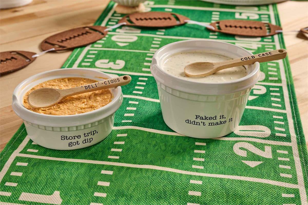 2-piece set. Ceramic container is perfectly sized to hold cold case dip containers. Comes with wooden spoon.