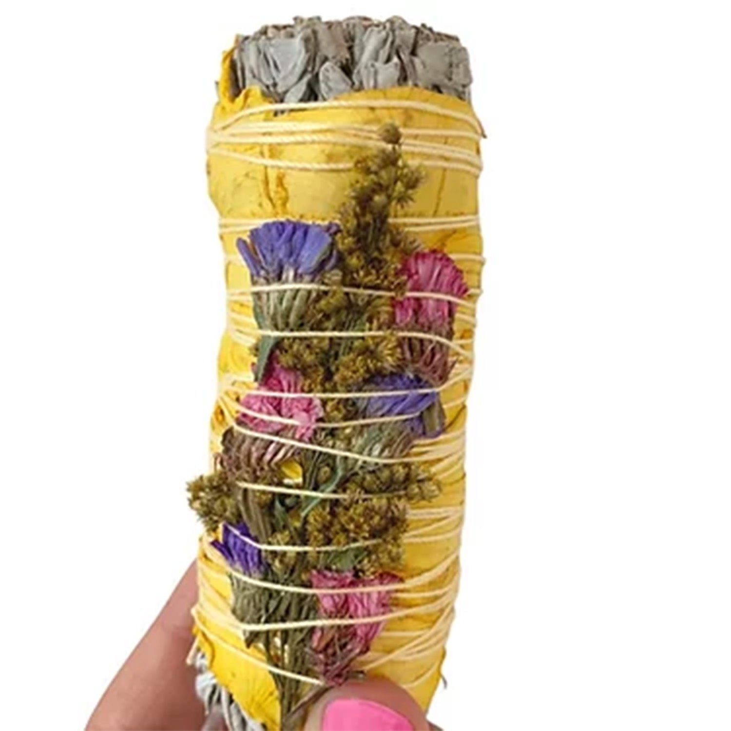 Our Sunshine stick makes the perfect gift for a friend or loved one ☀️ This stick is based with 100% organic white sage! Each stick is wrapped in yellow roses and topped with yellow yarrow, pink statice and purple statice. This is our most versatile sticks because yellow roses are symbol of caring without holding a romantic meaning. When burned, yellow roses produce a light and refreshing scent, while encouraging overall peace!