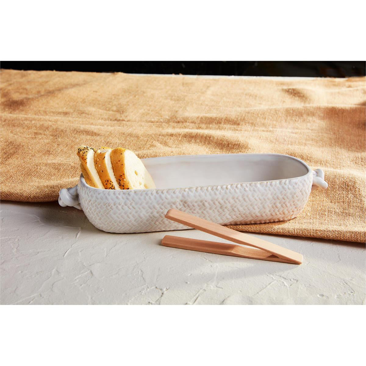 2-piece set. Reactive glaze stoneware bread bowl with textured surface detail. Comes with wooden tongs.