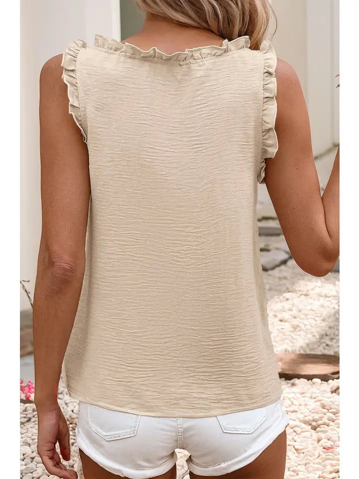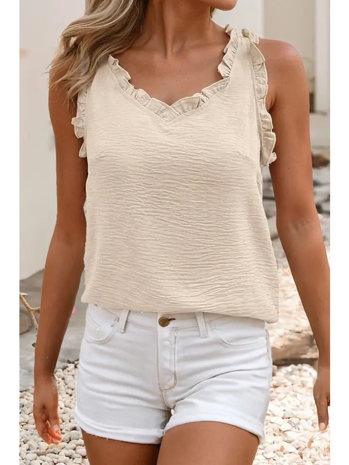 🌸 Elevate your summer wardrobe with this beautifully feminine tank, designed to add a touch of elegance to any look. 🌞 Crafted from soft, lightweight fabric, it promises comfort and breathability, keeping you cool on warm days. 🎀 The trendy textured shell, combined with frilled details along the neckline and armholes, adds a delicate and stylish flair that's perfect for any occasion.