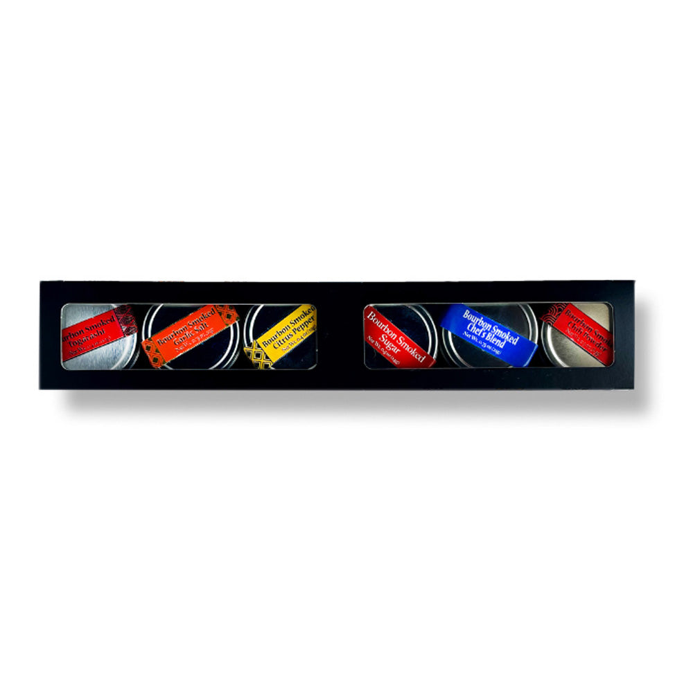 The set of six includes Bourbon Smoked Chili Powder, Bourbon Smoked Citrus Pepper, Bourbon Smoked Garlic Salt, Bourbon Smoked Togarashi, Bourbon Smoked Sugar and Bourbon Smoked Chef’s Blend.